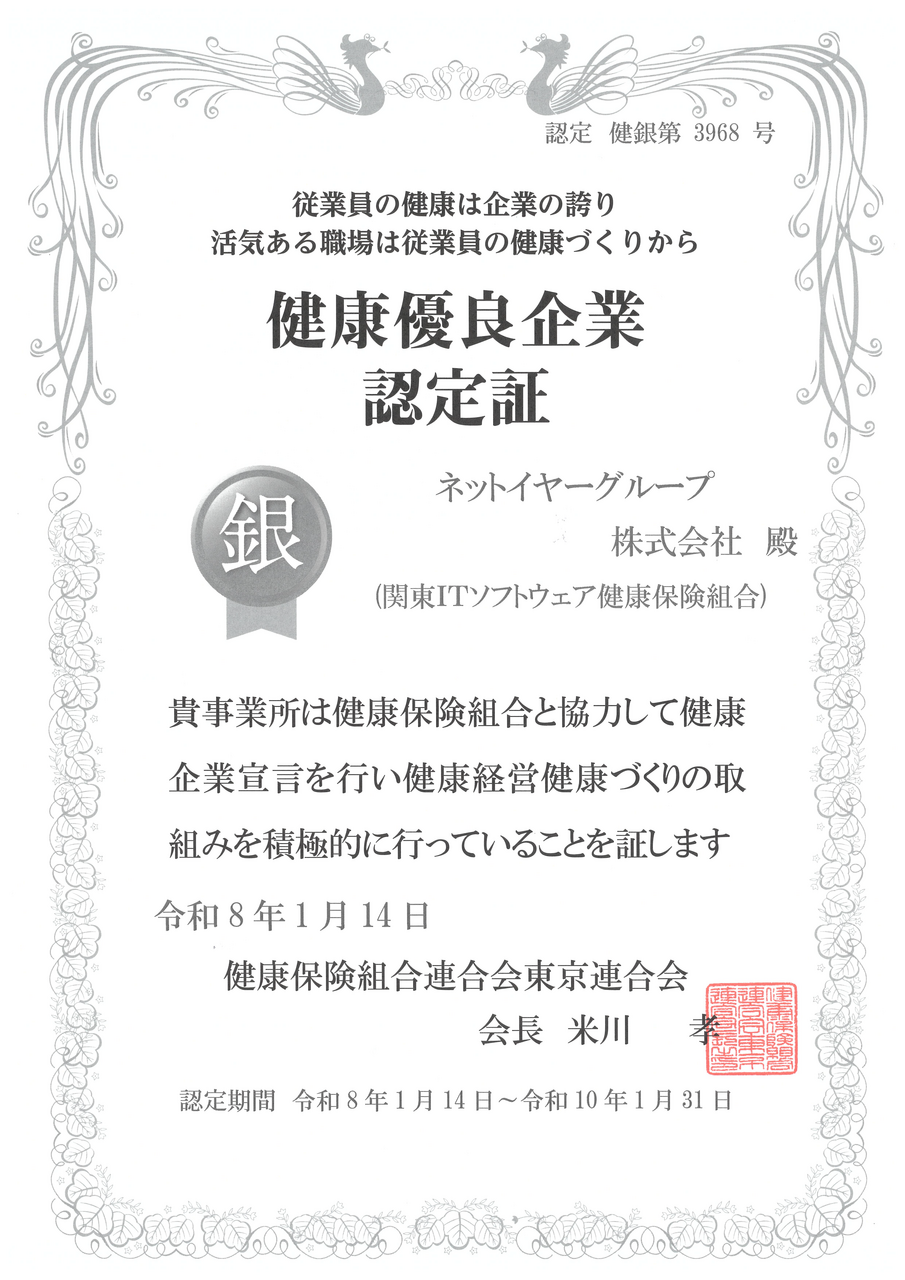 ネットイヤーグループは、健康保険組合連合会東京連合会が推進する「健康企業宣言」に参加し、健康優良企業「銀の認定」を取得いたしました。