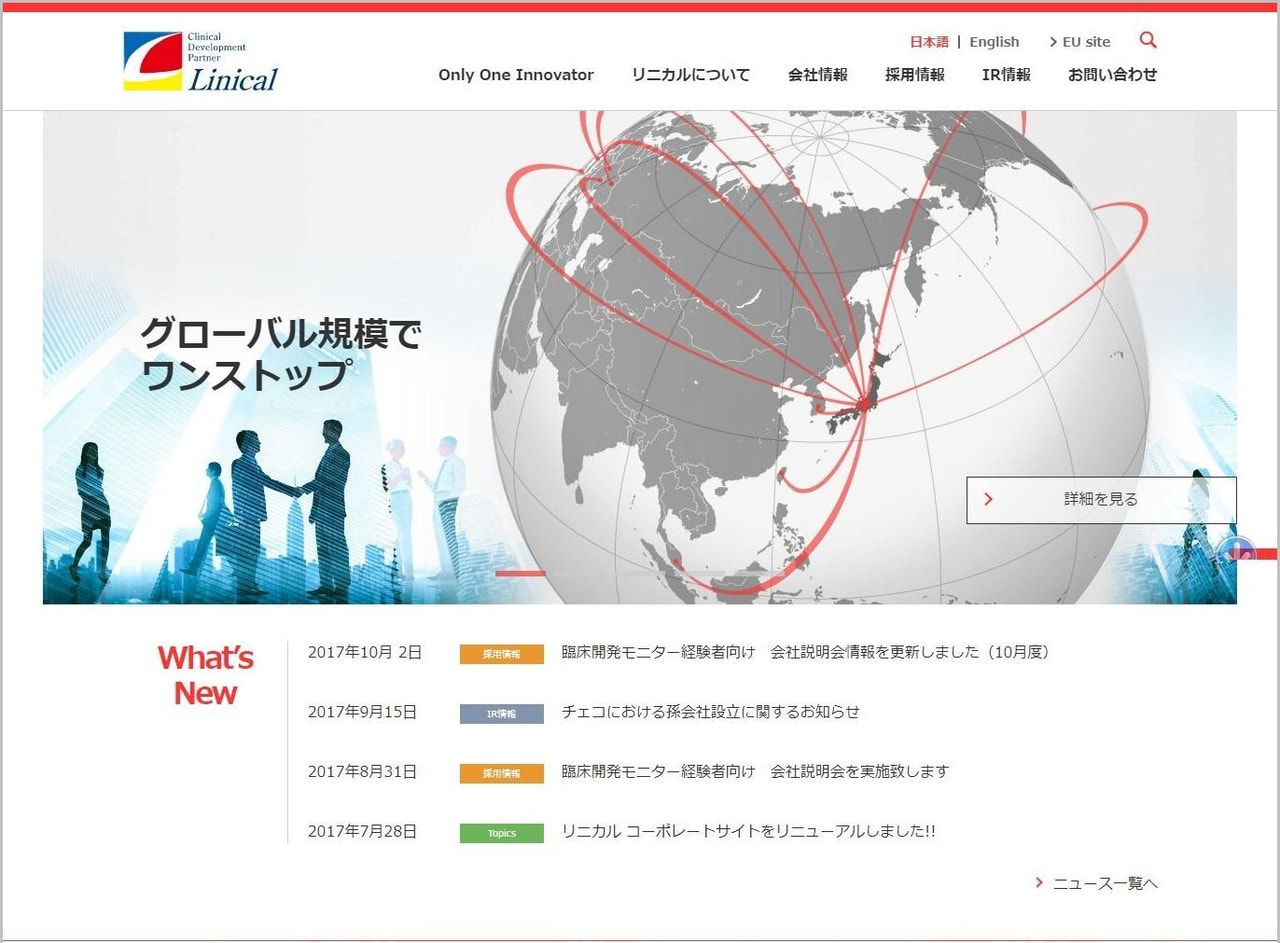 ネットイヤーグループは、医薬品開発業務受託機関(CRO)である株式会社リニカル(以下、リニカル)のウェブサイトのリニューアルプロジェクトを支援しました。アジア、欧州、米国で事業展開するCROとしてのスケール感、グローバリズムを表現。さらにコンテンツも整理し、営業案件コンタクトの増加、採用の強化、さらなるワールドワイドでの展開に貢献するサイトを目指しました。